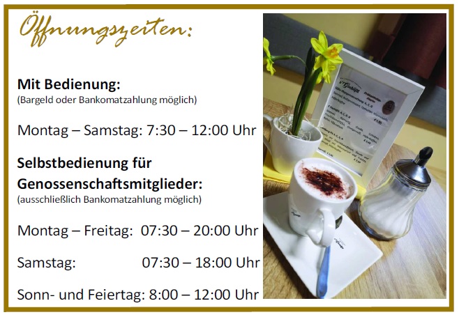 Das Geschäft wird an 7 Tagen die Woche die Versorgung mit den wichtigsten Gütern des täglichen Bedarfs, insbesondere mit regionalen und biologischen bäuerlichen Produkten, ermöglichen. Dazu gibt es außerhalb der Öffnungszeiten einen Zutritt mit einem Kartensystem. Somit kann täglich – insgesamt 72 Stunden in der Woche – eingekauft werden.